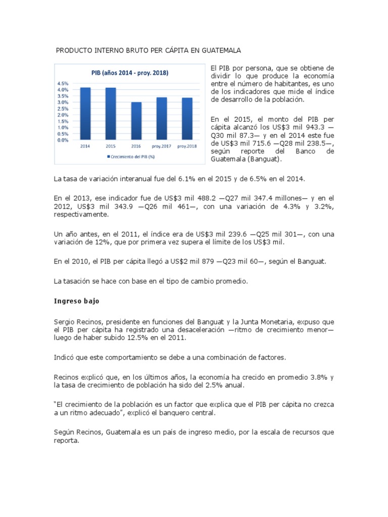 El producto interior bruto es el cálculo de toda la actividad económica de un país bajo ciertas condiciones que es el pib. La república de guatemala es un país perteneciente a américa central, cuya capital es la ciudad de guatemala.